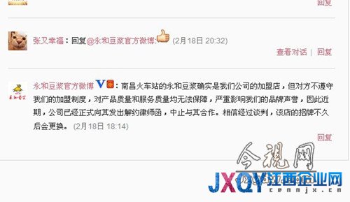“南昌火車站的永和豆?jié){確實是我們公司的加盟店,但對方不遵守我們的加盟制度,對產(chǎn)品質(zhì)量和服務(wù)質(zhì)量均無法保障,嚴(yán)重影響我們的品牌聲譽,因此近期,公司已經(jīng)正式向其發(fā)出解約律師函,終止與其合作。相信經(jīng)過談判,該店的招牌不久后會更換。”2013年2月,永和豆?jié){官方微博首次發(fā)出終止合作說明。