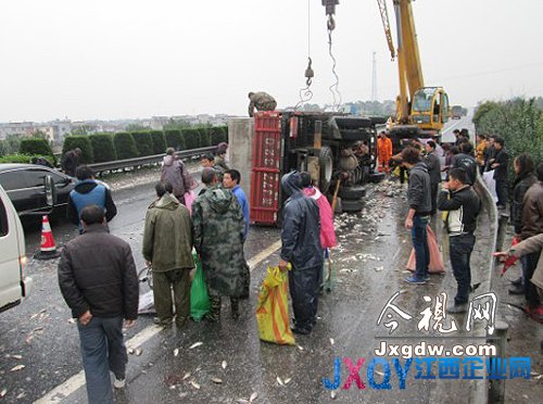 上饒:運(yùn)魚車高速側(cè)翻 9噸鮮魚“路上游”