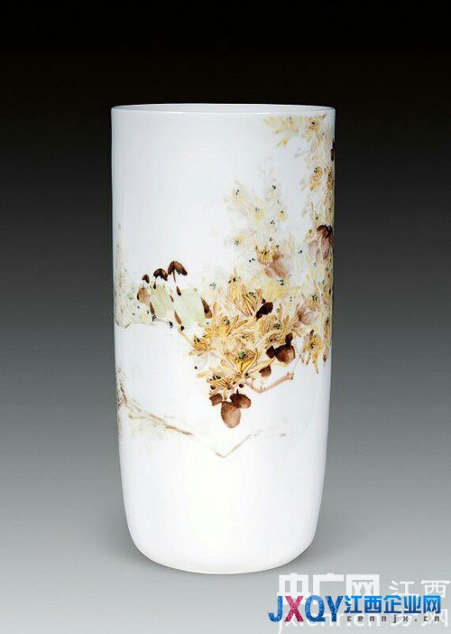 她的早期作品以青花為主,從2010年伊始,她開始充分運(yùn)用自己的油畫眼光,審視陶瓷的色調(diào)美。她的“醉秋”系列,瓷瓶上的菊花以黃色的暖色調(diào)為基底,富貴而不妖嬈,可親而不媚俗,菊中常又配以綠色這樣的冷色調(diào),以達(dá)到冷暖色調(diào)的均衡,遠(yuǎn)觀覺清新淡雅之氣悠然而生,近看點(diǎn)點(diǎn)綠色又給人一種生機(jī)盎然的感覺。