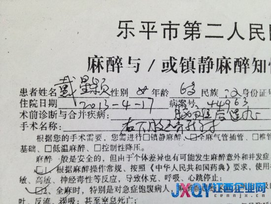在家屬向記者提供的樂(lè)平市第二人民醫(yī)院麻醉知情同意書(shū)和手術(shù)知情同意書(shū)復(fù)印件當(dāng)中,分別有戴勝亮和妻子劉雪梅的簽名,對(duì)于手術(shù)名稱(chēng)的描述當(dāng)中,右字有改動(dòng)的痕跡。那么究竟是否做過(guò)改動(dòng),記者找到醫(yī)院方面進(jìn)行核實(shí)。樂(lè)平市第二人民醫(yī)院副院長(zhǎng)張學(xué)林表示,這個(gè)應(yīng)該不是涂改的痕跡。“是寫(xiě)得右下肢啦,重寫(xiě)有可能,涂改可能不是。”