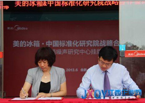 中國(guó)標(biāo)準(zhǔn)化研究院副院長(zhǎng)李?lèi)?ài)仙與美的冰箱事業(yè)部總經(jīng)理王建國(guó)簽署戰(zhàn)略合作協(xié)議
